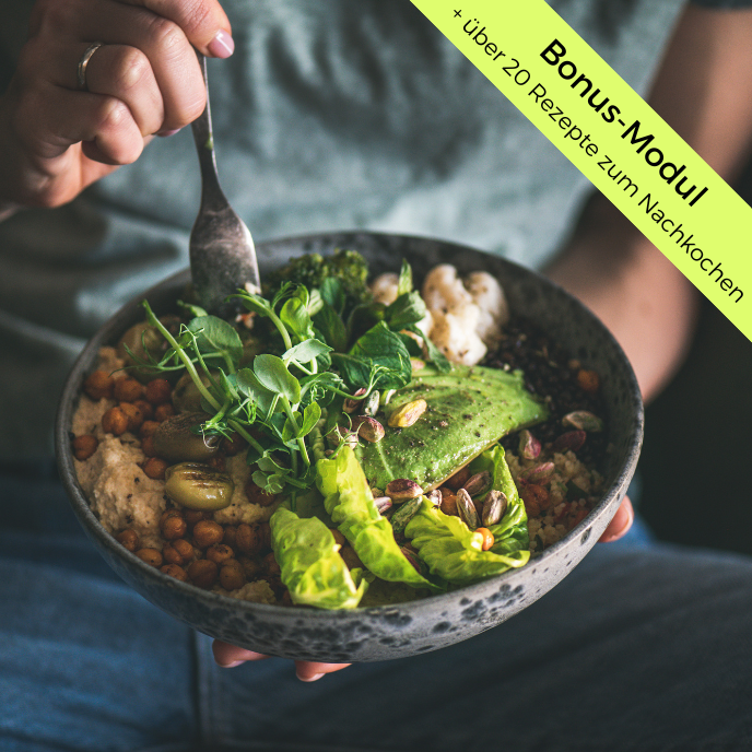 Außerdem bekommst du eine Auswahl von 10 einfachen Rezepten – für morgens, mittags, abends und zwischendurch. Sie sind nährstoffreich, alltagstauglich und helfen dir, dich spürbar wohler in deinem Körper zu fühlen.
